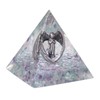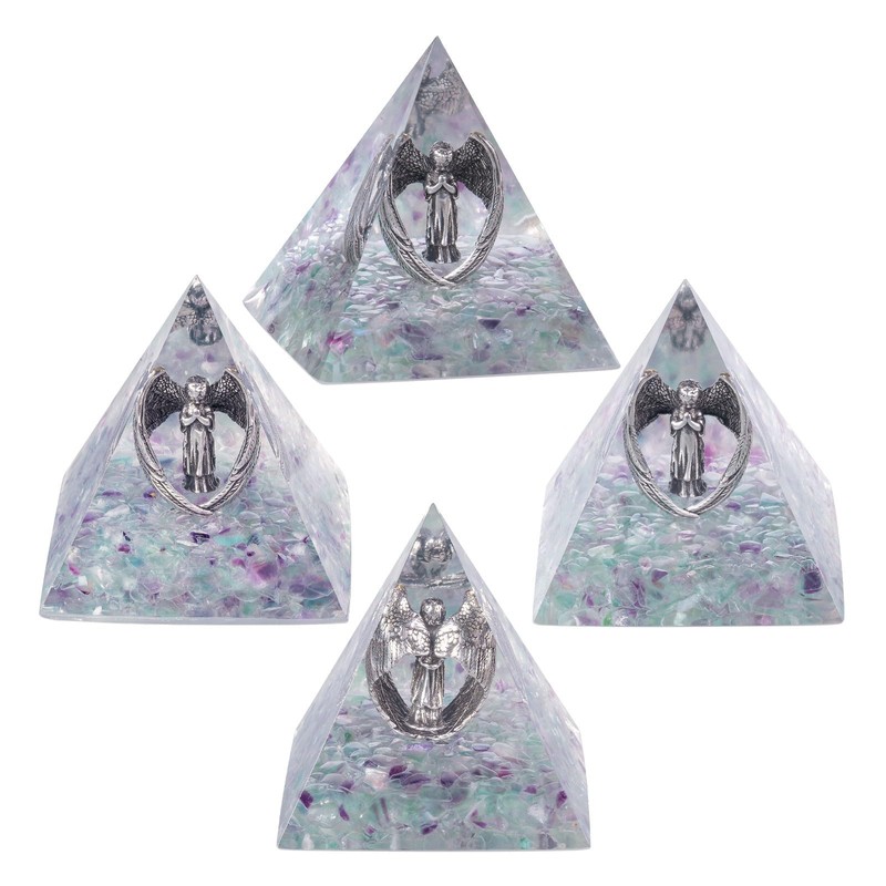 - Carved Praying Angel Pyramid: The surface of pyramid is made of resin, and the interior is made of fluorite tumbled stones and copper angel. The peace angel is carved in a praying motion and standing above the crystal chip stones.