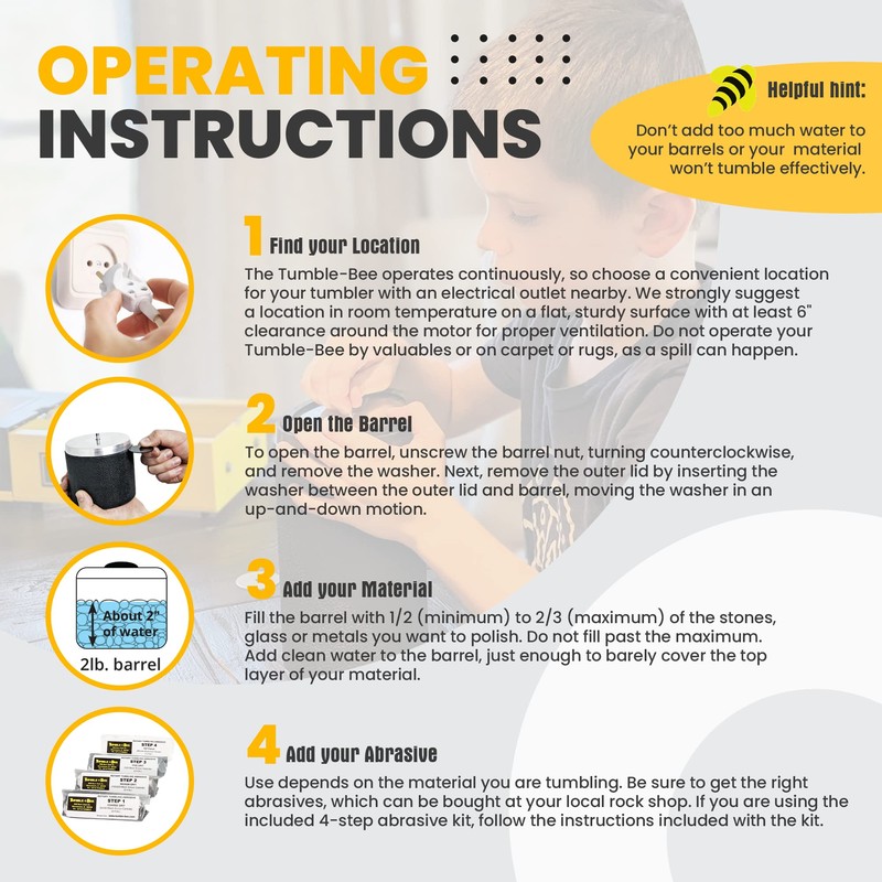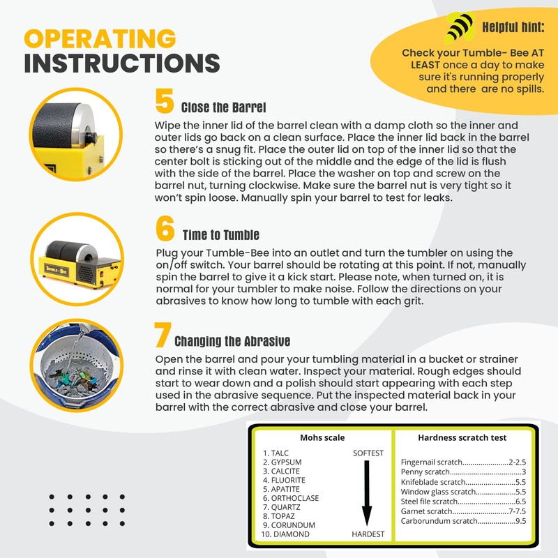 - MADE TO LAST: The Tumble-Bee rock tumbler has rust-proof housing with no sharp edges. It is made of a non-slip timing belt to reinforce the curve of the belt and protect it from slipping off the pulleys, allowing your rock tumbler to tumble smoothly. It also features a thermal overload protector, which turns off the motor if it overheats, safeguarding both you and your rock tumbler.