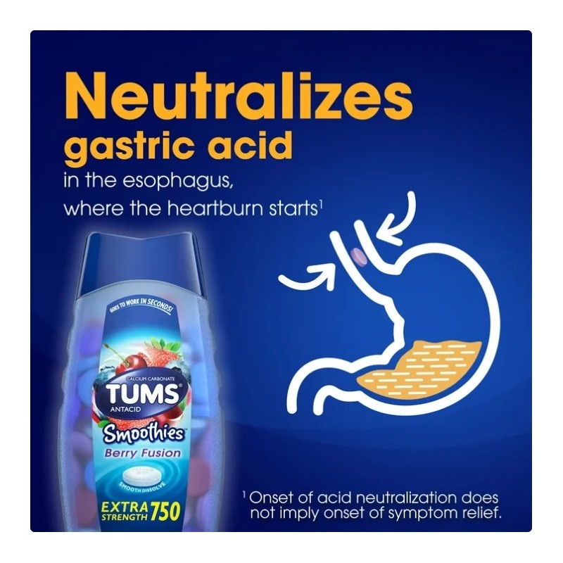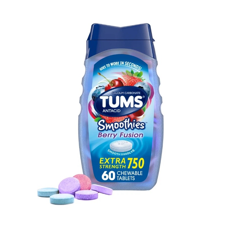 - CONTENTS: 60 TUMS Smoothies Chewable Antacid Tablets for Extra Strength Heartburn Relief, with a smooth taste and delicious Berry Fusion flavor
