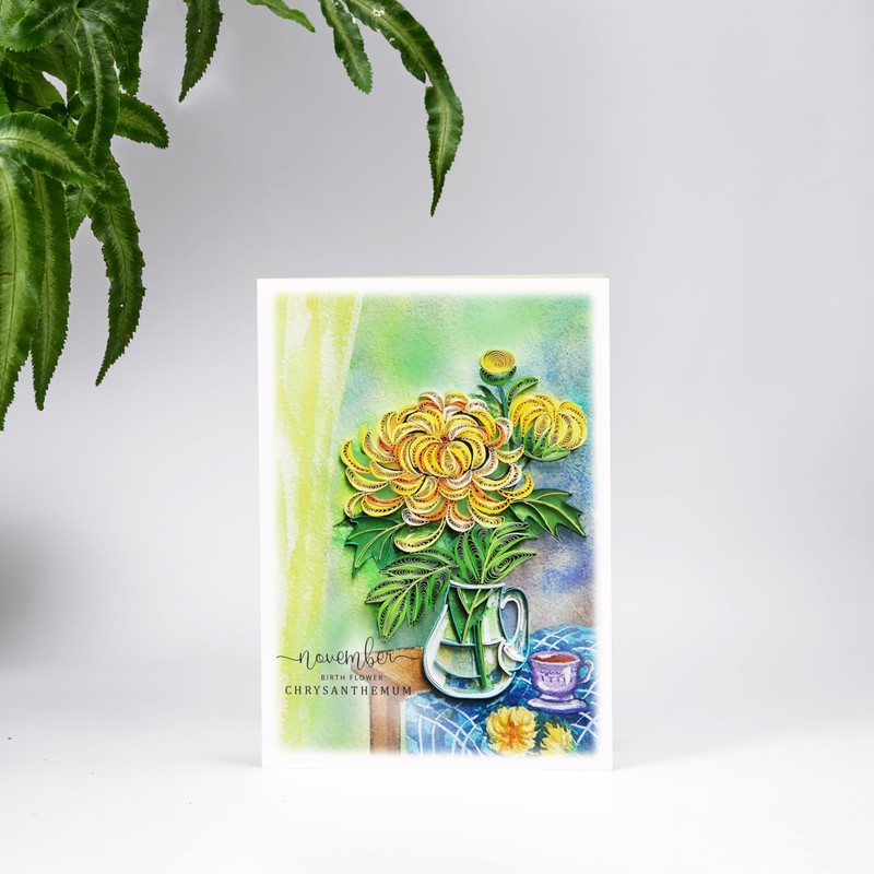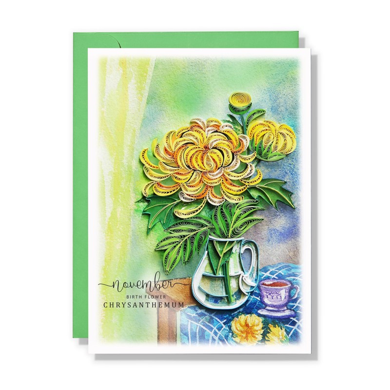 - GREAT KEEPSAKE: November Chrysanthemum Card is a beautiful greeting card that showcases the intricate and delicate quilled designs of yellow chrysanthemum flowers. In many cultures, the yellow chrysanthemum symbolizes friendship, happiness, joy, hope and well wishes. Our card is a perfect way to express warm wishes, appreciation, or gratitude to a friend or loved one. Its intricate design and beautiful color will make it a cherished keepsake that the recipient will treasure for a long time.