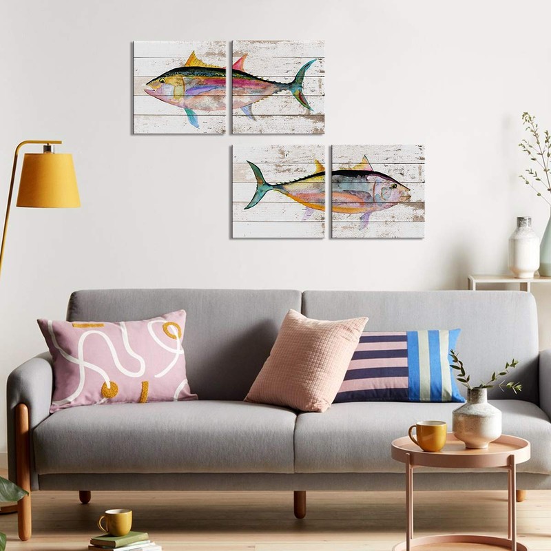 - đăTuna Fish Wall Art Ocean DecorăSize: 16 inch x 16 inch x 4 Panels(40x40cmx4). Beach theme fish wall pictures : Sea animals wall art. Colors : Teal, pink.Tuna (colorful fish) modern fish decor for home, this fish canvas wall art composed of vivid fish and wood grain background, realistic and vintage, can well match the decoration of your home and show your personality and enthusiasm for fish. Make every guest who enters your home exclaim "Wow, this fish is so vivid and alive".