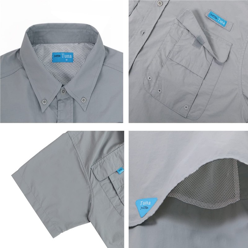 Tuna Men's Fishing Hiking UPF 50+ Sun Protection Anti-Static Waterproof Outdoor Two Pockets Button up Short Sleeve Shirts (Cool Grey #2 3XL)