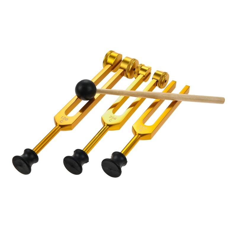 Tuning Fork Set(128Hz, 256Hz, 512Hz), Tuning Fork Instrument for Chakra with Hammer, Rubber Base, Storage Bag and Cleaning Cloth, Gold