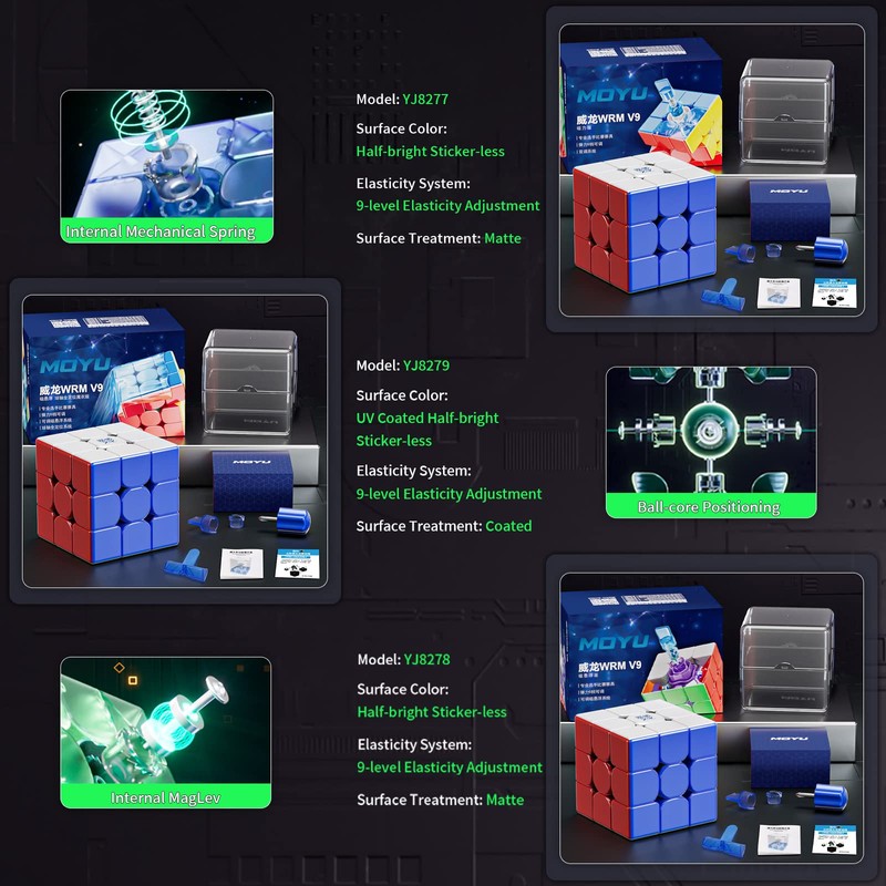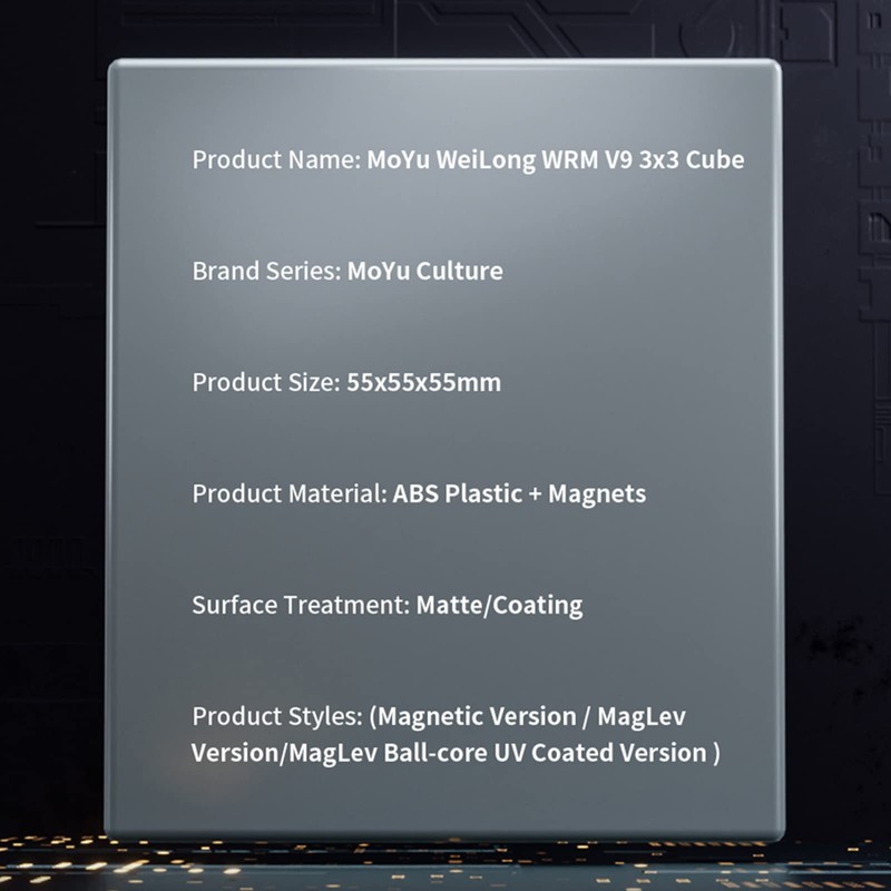 - 【MoYu WeiLong WRM V9 Maglev Speed Cube】 WeiLong WRM V9 is MoYu's newest flagship 3x3!The version features is New elastic adjustment system and Maglev technology, corner to core magnetism using a ball core, and a beautiful UV coated Clother