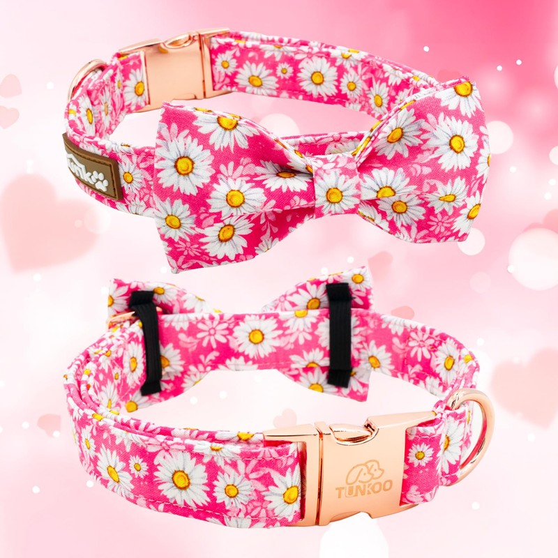 Tunkoo Pink Daisy Dog Collar with Cute Flower Bow Tie, Adjustable Premium Cotton Collar Durable Metal Buckle for Small Medium Large Boys Girls Dogs, L