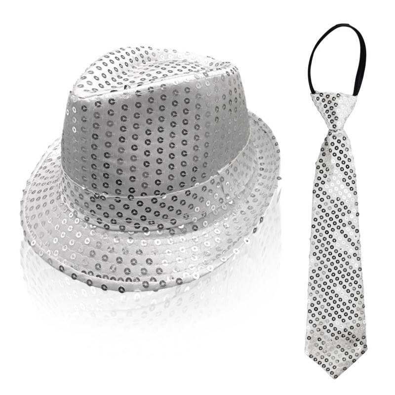 TUONYIS 2 Pieces Jazz Dance Hat Sequin Hat Necktie,Sequin Fedora Hat for Party 70s Disco Costume for Boys Girls Hip-Hop Shiny Disco Hat for Hen Party Night Jazz Dancers. (Silver)