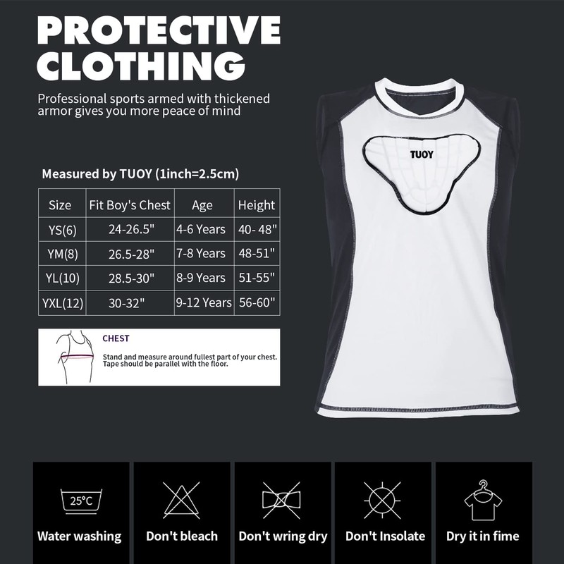 - COMFORT – Made of Breathable compression 10mm high resilience EVA foam and Lycra + polyester fabric, this chest protector padded shirts keep your body cool and dry, provide great protection for sport.