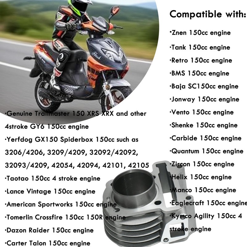 - Package include: Cylinder x1, Piston Kit x1, Piston Ring Set x1, Gasket Kit x2, Valve Oil Seal x2, Intake Studs x2, Outlet Studs x2, Nut x2,Spark Plugx1