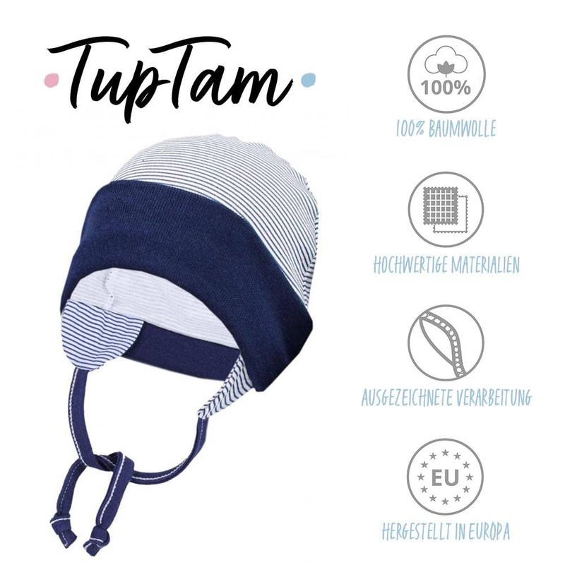 This lightweight tie-on baby hat from the children's brand TupTam is perfect for those first months of life. Available in an set of 2. Made from a skin-friendly fabric made from pure cotton. The soft cotton feels comfortable and ensures optimal breathability. Thanks to careful workmanship and high-quality materials, a perfect fit and optimal comfort are guaranteed. The practical ties ensure a good fit, as well as a correct position on the baby's head. This newborn hat is also equipped with ear flaps to protect their sensitive ears. Available in the following colours: blue, grey, pink and white. The hats should definitely form part of any baby's first wardrobe. Made in the EU.