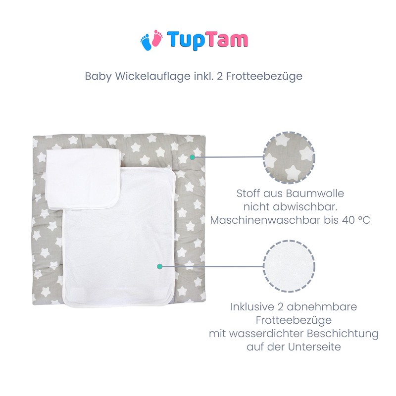 This high-quality changing mat with removable terry cloth cover from TupTam is an essential changing accessory for any baby's room. The cushion is made of a smooth fabric (pure cotton) and is softly and thickly padded with anti-allergic, breathable polyester fleece (thickness approx. 6 cm). On the front, the changing mat is equipped with a removable waterproof terry towel, which absorbs the liquid and does not let through. The changing table as well as the changing mat stay dry and clean. The soft terry cloth cover is washable at 40 degrees. While the first cover dries, use the replacement cloth included in the offer. This large changing mat is available in four sizes: 70 x 70 cm, 76 x 76 cm, 75 x 80 cm (H x W), 75 x 85 cm (H x W). With us you will find the right size for any changing table. You can choose from tasteful colour and pattern variants such as polka dots (pink, blue, beige), stars (grey), hearts (pink, turquoise), etc. Made in the EU with great attention to detail. !