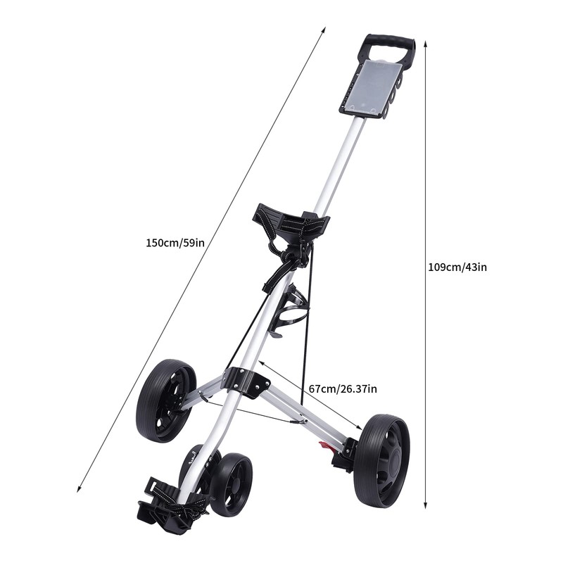 - Stylish Design: With a modern silver and black color scheme and sleek triangle design, this golf push cart looks as great as it performs and complements any standard-sized golf bag.
