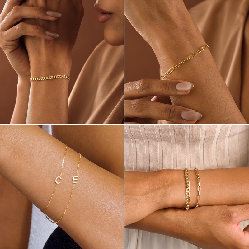 - Stackable Gold Bracelets Sets: Includes 3 bracelets in individual styles, Personalized Initial Bracelet, Cuban Link Chain Bracelets and Paperclip Chain Bracelets. These gold bracelets sets can greatly show your elegance and beauty, and add brilliance to your daily matching. Recommended Age Grading : 6+.