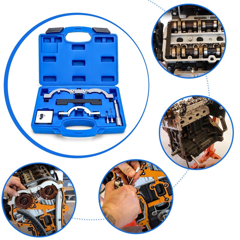 - Kit includes: 1* Camshaft sprocket fixing tool, 1* Crankshaft locking pin, 1* Camshaft setting plate, 2* Chain tensioner locking pin, 2* Camshaft sensor setting tool (usually 7 pieces) with a carrying case