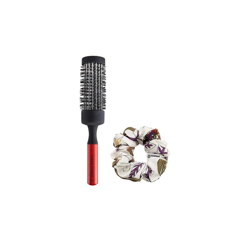 Elevate your hairstyling game with the Turbo Power Hair Brush 1.5" (barrel size) Magnesium Thermic Booster Z.41. This brush heats swiftly for efficient, smooth styling. Paired with the Goomee Scrunchie, offering a secure hold without hair damage, this bundle brings an element of surprise with scrunchie colors varying based on stock availability. Achieve salon-quality results effortlessly at home.