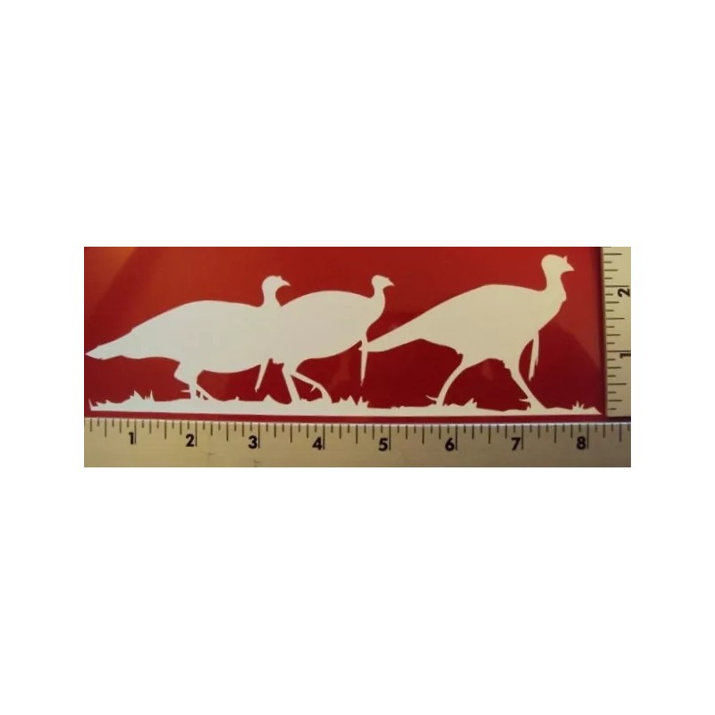 Up for sale is a quality turkey decal. It is made from a high performance vinyl. The dimensions are approximately 8.25"W X 2.5"H. This will make your ride stand out from the rest! Picture is shown on red background with rulers for DISPLAY PURPOSES ONLY!!! YOU DO NOT GET THE BACKGROUND COLOR OR THE RULERS!! ONLY THE TURKEYS IN THE COLOR YOU CHOOSE!!