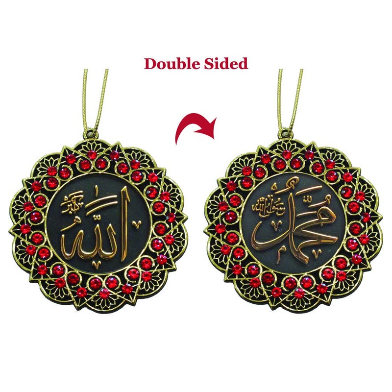 - This star shaped, double sided car hanger features Allah and Muhammad in intricate Arabic calligraphy.
