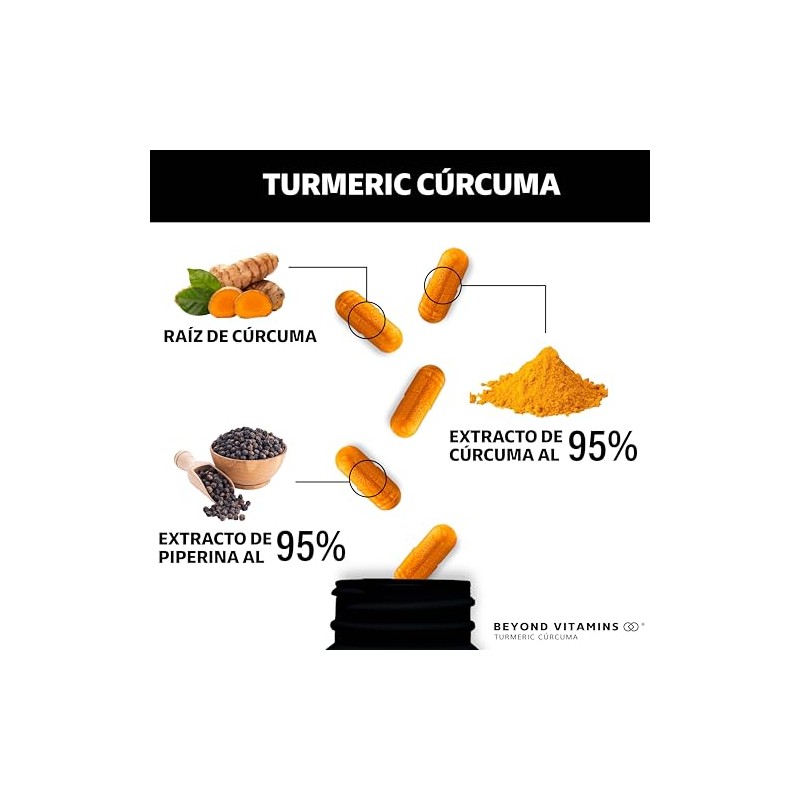BEYOND VITAMINS - Turmeric Cúrcuma con Extracto de Raíz de Cúrcuma Estandarizada al 95% y Pimienta Negra al 95% - Suplementos formulados con alta potencia y absorción - Alta Potencia con 95% de Curcuminoides Estandarizados - Suplemento Alimenticio en Cápsulas - Ingredientes NON GMO (150 cápsulas). 🏆 Reconocido por su excelente relación calidad-precio. Materiales de alta gama y acabados premium. 💎 Calidad superior certificada. Ideal para quienes buscan lo mejor en calidad y estilo. Producto auténtico con satisfacción total asegurada. ¡No te quedes sin el tuyo y aprovecha esta oportunidad única!