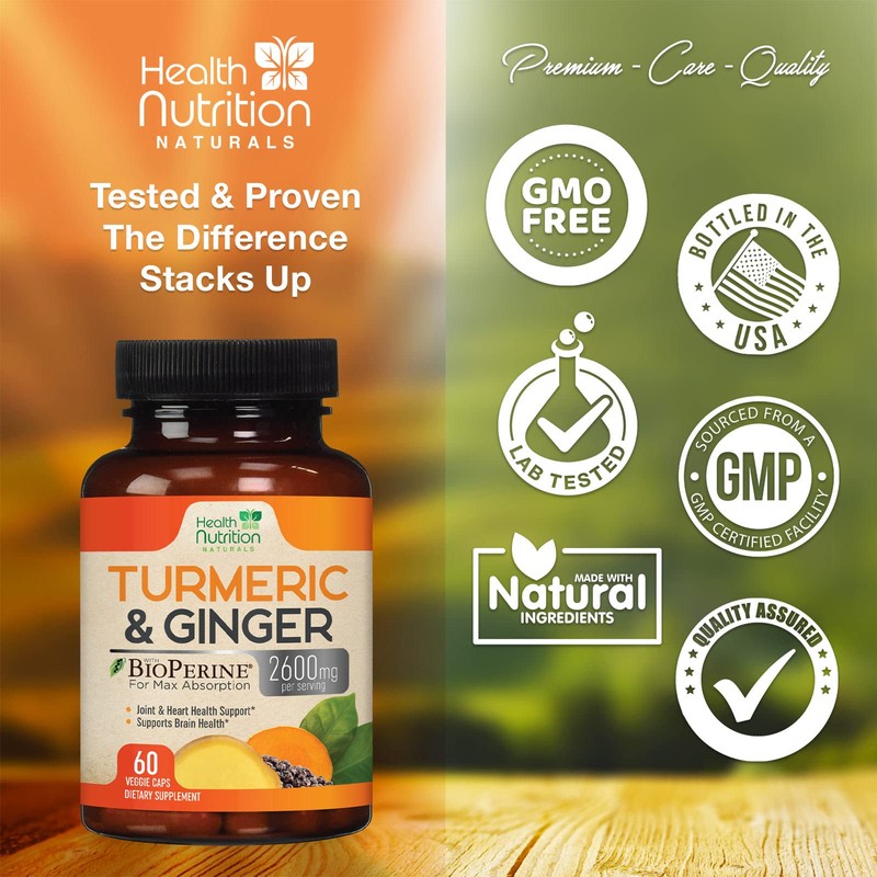 - Powerful Turmeric & Ginger: Our premium T3 Turmeric Curcumin Complex 2600mg; with 95% standardized curcuminoids; and enhanced with 15mg BioPerine and Ginger to provide maximum absorption and bio-availability