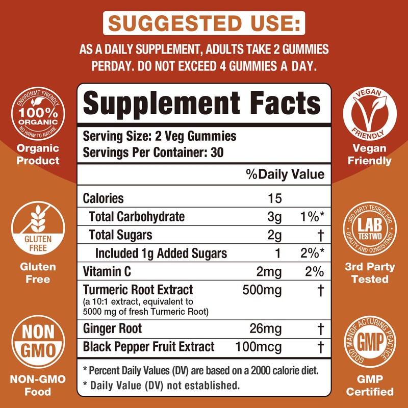 - CONVENIENT TO CARRY AND EAT: Individually wrapped design makes this curcumin gummies a great companion anywhere you go. Whether you are traveling, between jobs or at a casual gathering, it can easily satisfy your health cravings. A single gummy can bring you full of energy and vitality.