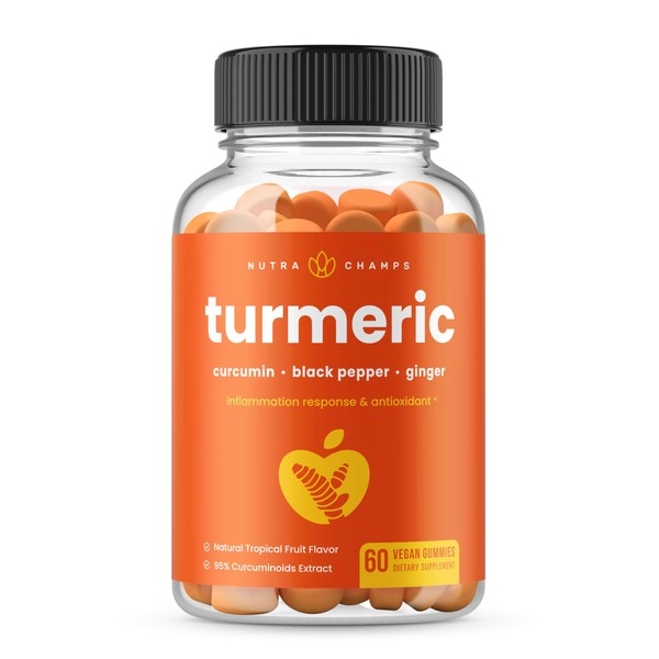 NutraChamps Turmeric Gummies for Adults & Kids with Ginger & Black Pepper Extract, 95% Curcuminoids, Vegan Natural Curcumin Joint Support Supplement, Tumeric Gummy Supplements