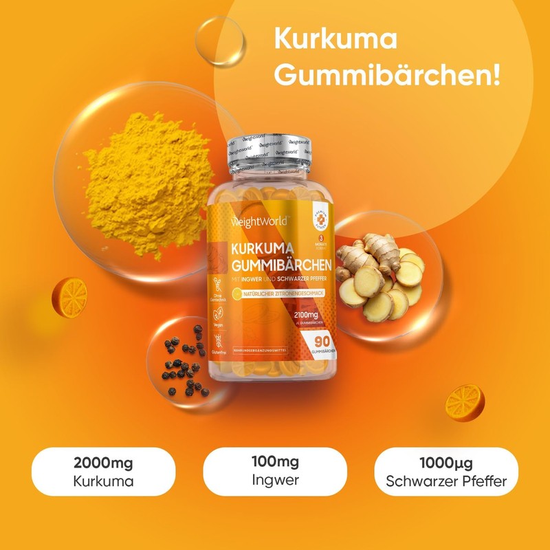 - Curcuma gummy bears - gummies with turmeric are an ideal alternative to capsules, powders and tablets as they do not need water and can be chewed anytime, anywhere. Our turmeric extract with ginger and black pepper has a high bioavailability. Each pack contains 90 vegan gummy bears that provide you with 3 months.