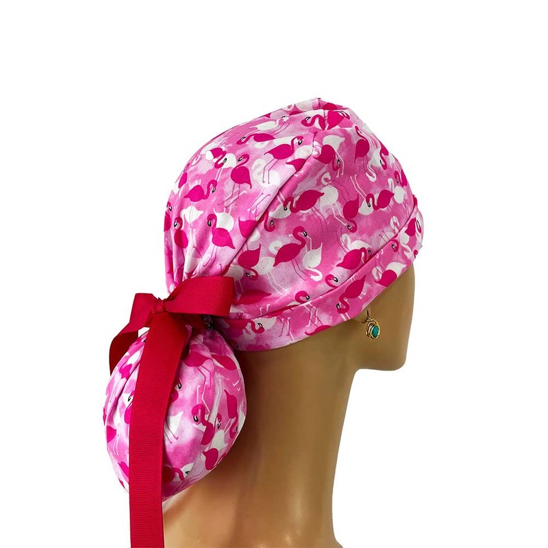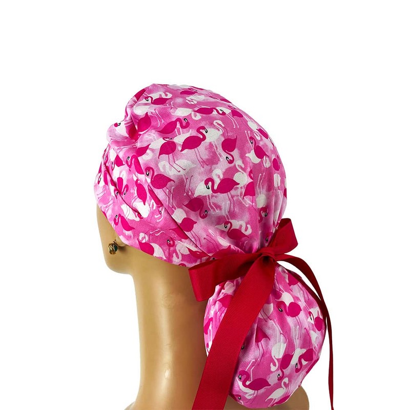 Turn Up Ponytail Medical Scrub Cap - Pink Flamingo Allover. - Bouffant Scrub Hats, Unisex Surgical Caps, Dr. Hats, Nurses Hats. Scrub Hat for Women & Men tie Back | Working Cap with Holder