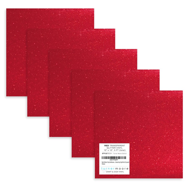 Turner Moore Edition Red Glitter Vinyl Adhesive 12x12, 5-Pack Transparent Glitter Vinyl Sheets for Cricut, Crafts, Scrapbooking, Stickers, Decals for Bottles and Tumblers