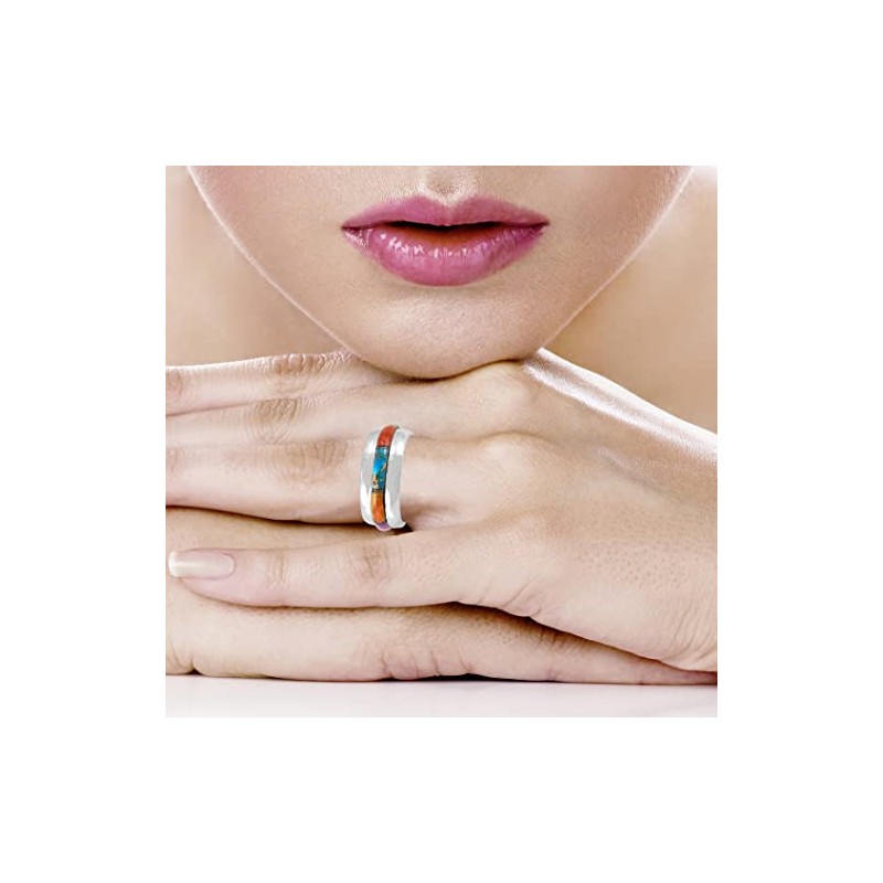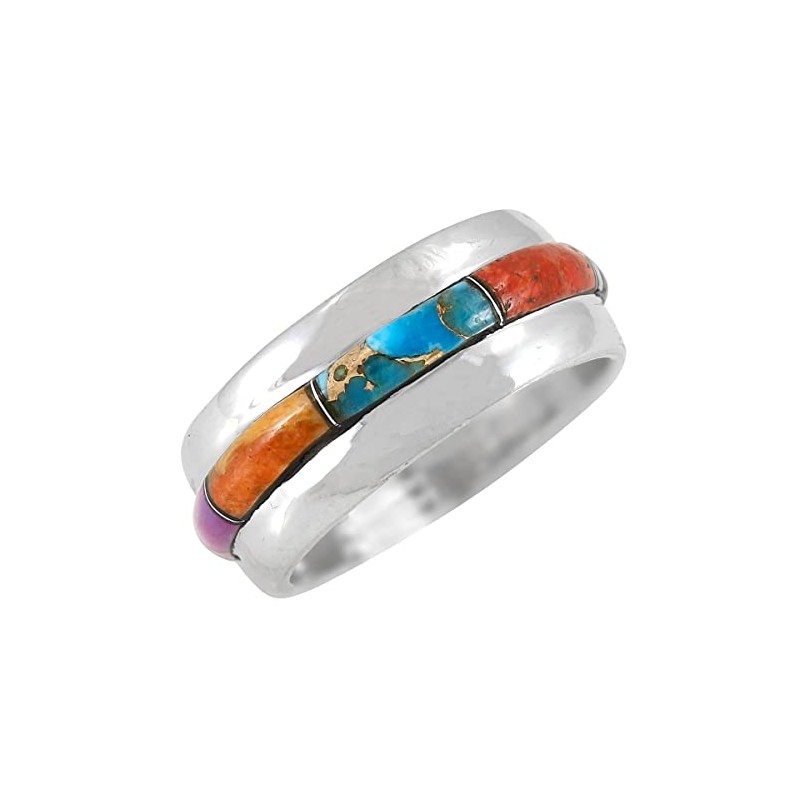Turquoise Band Ring Sterling Silver 925 Genuine Gemstones (Wide-1/3", Multi-G...