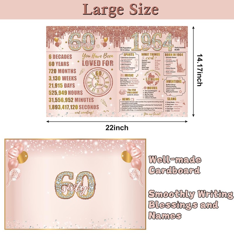 - 【Back in 1964 60th birthday themed design】The double-sided design incorporates pink rose gold tones, featuring birthday elements like balloons and fireworks, commemorating significant events from 1964. It is both interesting and meaningful.