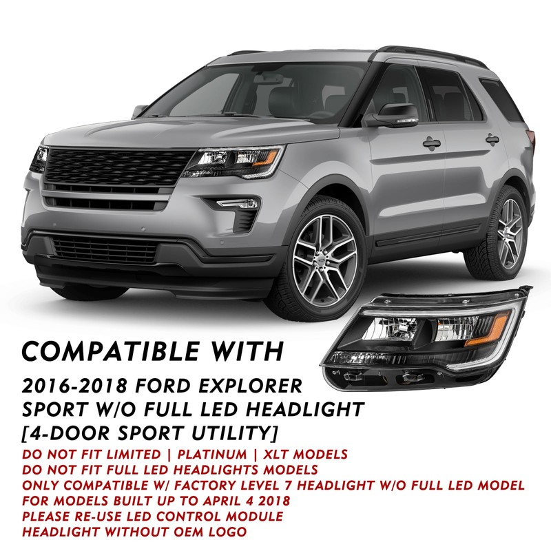 - 【SUITABLE MODELS】Headlights Assembly Compatible With 2016-2018 Explorer Sport. ATTN: Do Not Fit Limited | Platinum | XLT Models. Do Not Fit Full LED Headlights Models. ONLY Compatible w/ Factory Level 7 Headlight w/o Full LED Model. For Models Built Up To April 4 2018. Please Re-Use LED Control Module. Headlight without OEM Logo. Bulbs are not included. High beam bulb type: 9005; low beam bulb type: LED; signal light: 3757NAK; side marker light: LED.