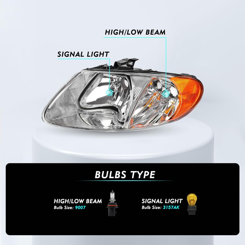 - 【SUITABLE MODELS】Headlights Assembly Compatible With 2001-2004 Chrysler Town & Country; 2005-2007 Chrysler Town & Country Base ( not fit long 119" wheelbase); 2001-2003 Chrysler Voyager; 2001-2007 Dodge Caravan / Dodge Grand Caravan.High/low beam bulb type: 9007; Bulbs are included