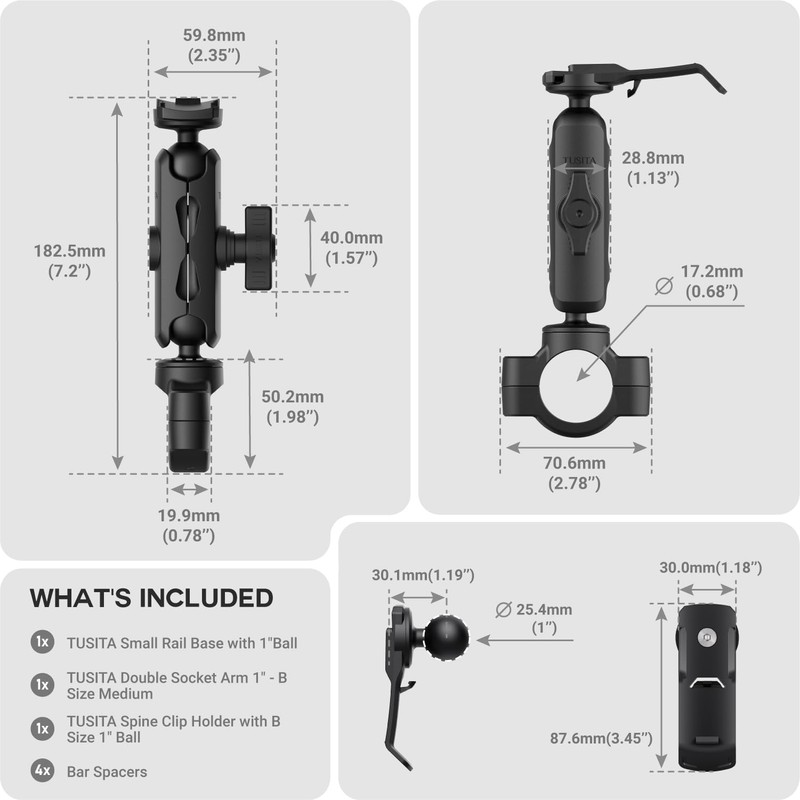 - 【Lieferumfang】 TUSITA Kleine Schienenbasis mit 1" Ball x1; TUSITA Doppel-Socket Arm 1" - B Größe Mittler x1; TUSITA Wirbelsäulenclip-Halter mit 1" B Größe Ball x1; Bar-Abstandshalter x4