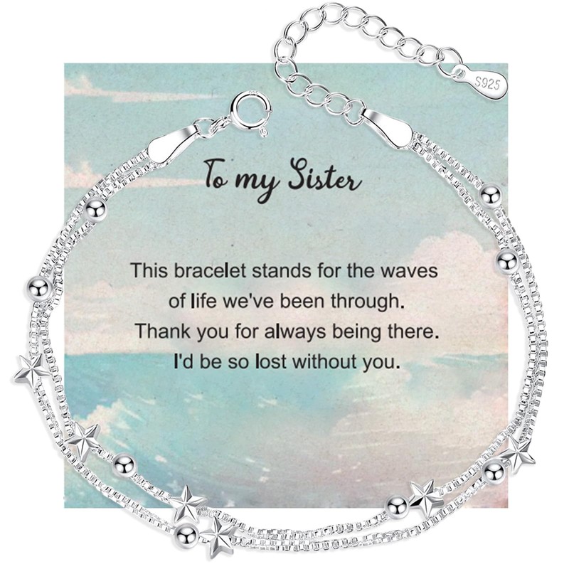- 🎁Wonderful design:Six stars and eight pearls hang on the string of this delicate chain and make up this pretty ladies bracelets,and it ready to deliver a moment of happiness.The silver bracelet for women comes in a gift box with a sweet greeting card,The cards feature sweet verses and meaningful sentiments.It's perfect as a gift for sister from sister.