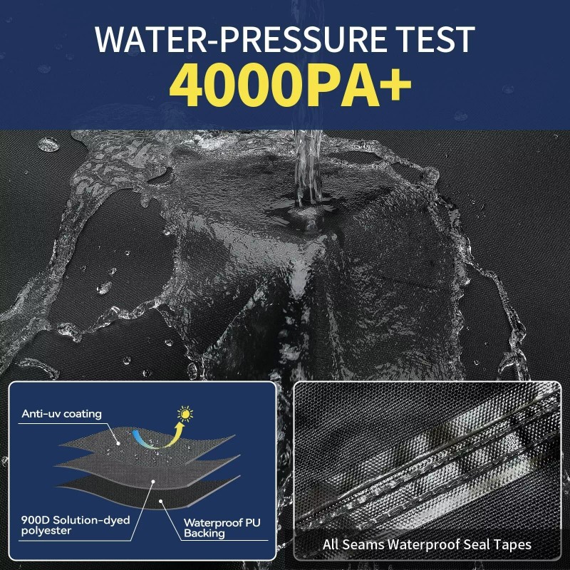 - 100% Waterproof: True 900D Marine Grade Polyester Canvas (The quality of true 900D fabric is better than the false 900D fabric)+ waterproof PU coating + anti-UV coating, can withstand up to 4000pa Water pressure; Additional, Inner Waterproof tape at seams Prevents Water leaking; Please use SUPPORT POLE beneath the cover, avoid water accumulate!