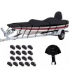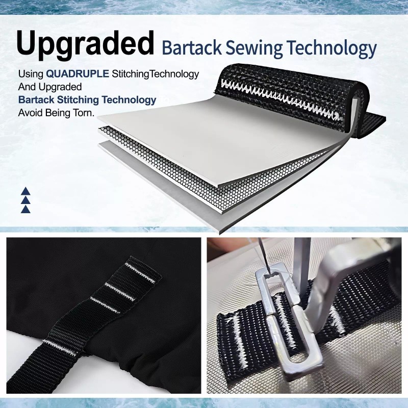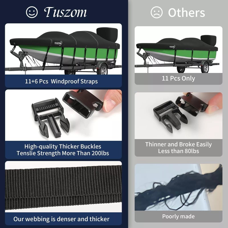 - Upgraded Towing and Mooring features: The widened 2" webbing ring is secured with 4 stitches,the force is better to avoid the loss of the webbing ring; The Boat cover comes with more 11+6 pcs tie-down straps and buckles than the competition to secure the cover to the trailer more securely. Easy towing and avoid tearing on the way, integrated buckle and adjusable strap tightening system provides easy installation and quick release