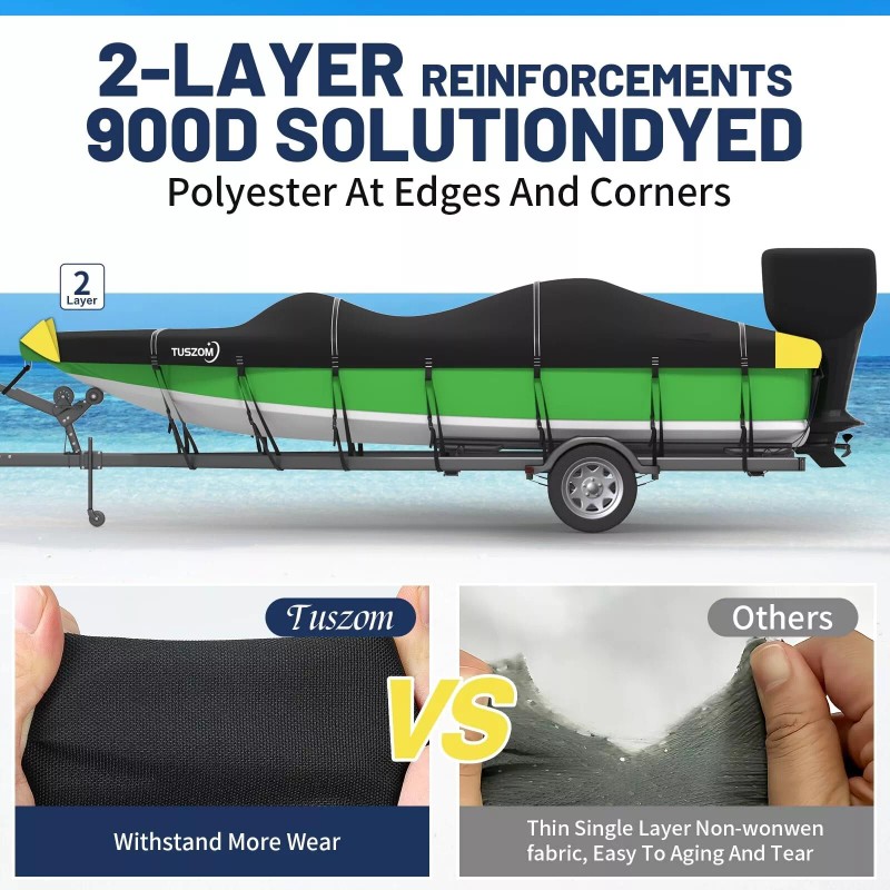 - 900D Solution-Dyed Polyester: Thickened 900D solution-dyed fabric fade resistant for 5 years, Tuszom Boat Cover reaches UPF 50++ to ensure 95% UV protection, Anti-UV ability increased by 60% than others, avoid aging, disintegration and tearing due to exposure to the sun; 900D is way heavier canvas than 600D /420D /300D; Double stitching, bow is double reinforced, and won't tear easily at the sharp elbows