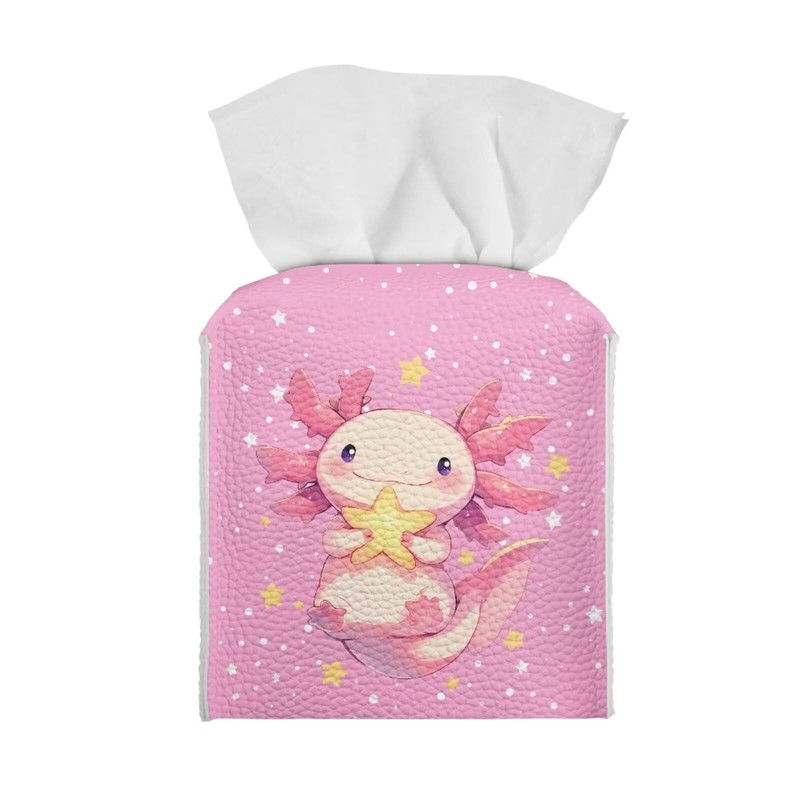 Tutolipy Pink Tissue Box Cover Square, Leather Novelty Cube Box Holder Facial Paper Case Home Decoration for Bathroom, Home, Car, Nightstand, Office Desk (Cartoon Axolotl, 5.1" x 5.1" x 5.5")