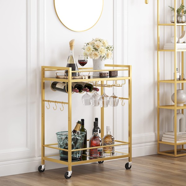 TUTOTAK Bar Cart, Serving Cart for Home, Drink Cart, Mobile Kitchen Shelf with Wine Rack and Glass Holder, Rolling Beverage Cart, Gold BC01BB031