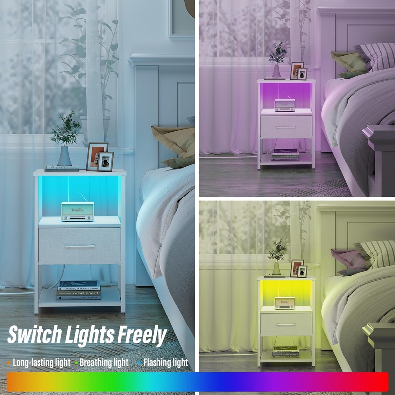TUTOTAK LED End Table, Side Table with Charging Station, Nightstand Set of 2, Bedside Table with Fabric Drawer, Couch Table for Livingroom and Bedroom, Whtie TB01BW0692L