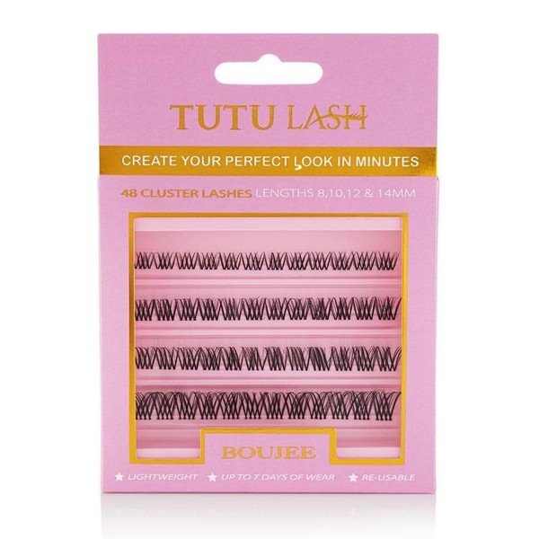 Soft, Lightweight Cluster Lashes : The Boujee Cluster box includes 48 lash cluster (ranging from 8-14mm length, 12 x 8mm, 12 x 10mm, 12 x 12mm, 12 x 14mm). The Cluster lashes are re-usable (if removed correctly with the Tutu Lash Remover).