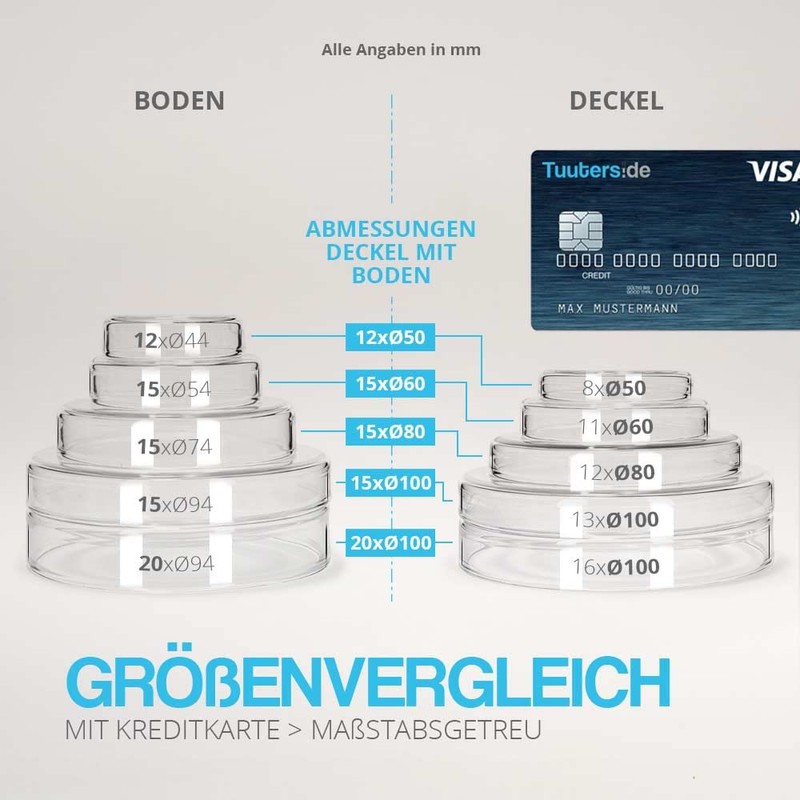 Available in sizes 12x50mm, 15x60mm, 15x80mm, 15x100mm and 20x100mm. In addition, we also offer the Petri dishes in sets with higher quantities and also high-quality plastic petri dishes.