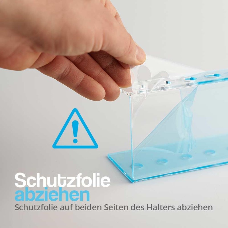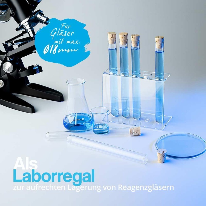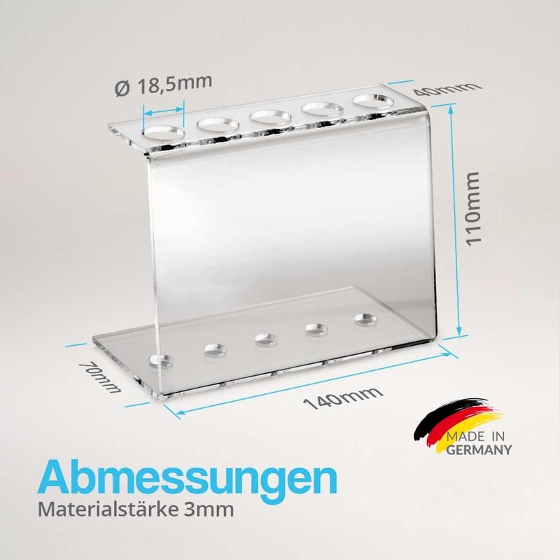 Included is a 5-hole acrylic test tube holder made of high quality crystal clear acrylic glass. This is available for 3 different test tube diameters with 16.5 mm, 18.5 mm, 20.5 mm and 30.5 mm.
