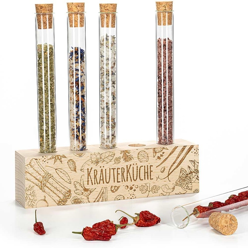 - Engraved spice rack with test tubes and corks
