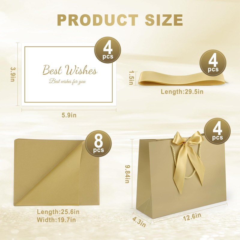 - 【About Gift Bag Set】:Our gift bags with handles set size is 12.6" x 9.8" x 3.9" ,which is perfect for medium gift, 4-piece set includes 4 gift bag, 4 greeting card, 8 tissue Paper and 8 Bow Ribbon