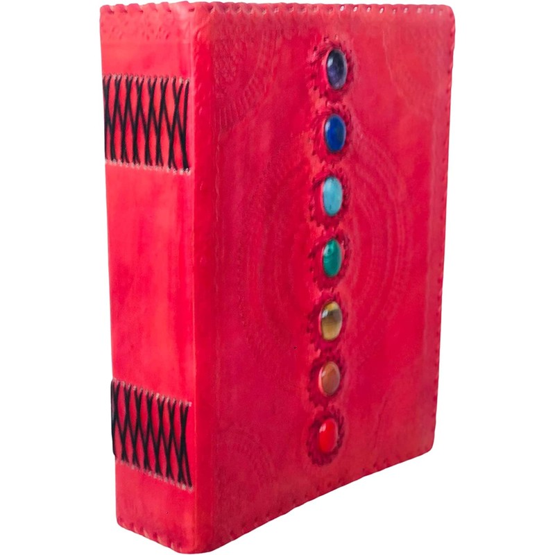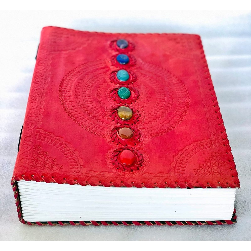 - Material and Design :This beautifully crafted journal is made from high-quality genuine leather, ensuring both durability and a timeless aesthetic. The leather has been treated to give it a vintage, rustic appearance, accentuated by a meticulously hand-embossed pattern that showcases traditional craftsmanship. The front cover is adorned with multiple securely set semi-precious stones, adding a unique and luxurious touch.