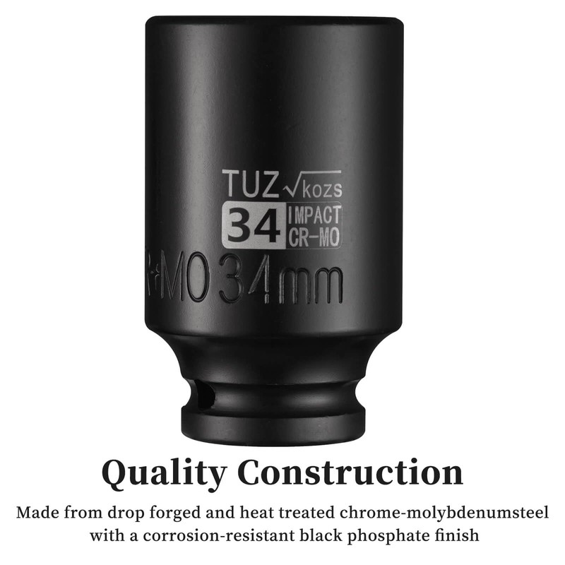 TUZkozs 1/2-Inch Drive 34mm Deep Impact Socket with 6-Point Design, Heat-Treated Chrome Molybdenum Alloy Steel, Metric,Hex Deep Socket