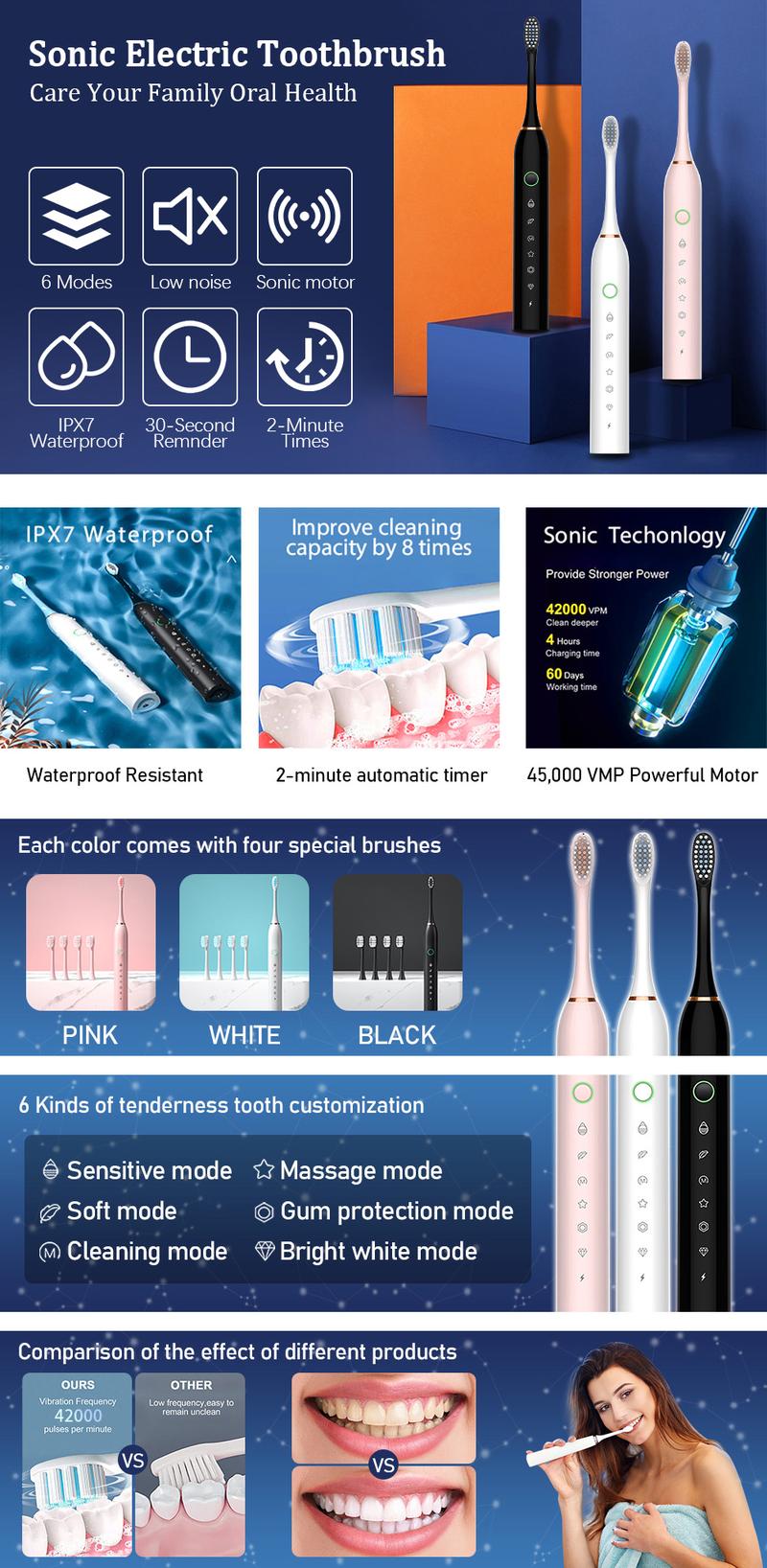 - 【6 Cleaning Modes & Rechargeable】The toothbrush has 6 modes: Sensitive, Gentle, Clean, Massage, Gum Protection and Brightening, suitable for different mouths and gums. The electric toothbrush is designed with USB charging, compatible with any charger or device with a USB interface, and can be used for 60 days on a full charge!