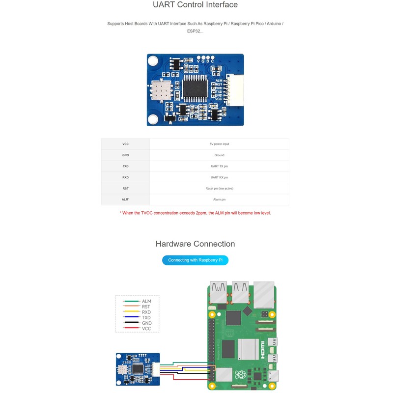 UART Interface Compatibility: Effortlessly integrate the sensor with popular development boards like Raspberry Pi, Arduino, ESP32, and Raspberry Pi Pico for IoT projects, air quality monitors, or smart ventilation systems.