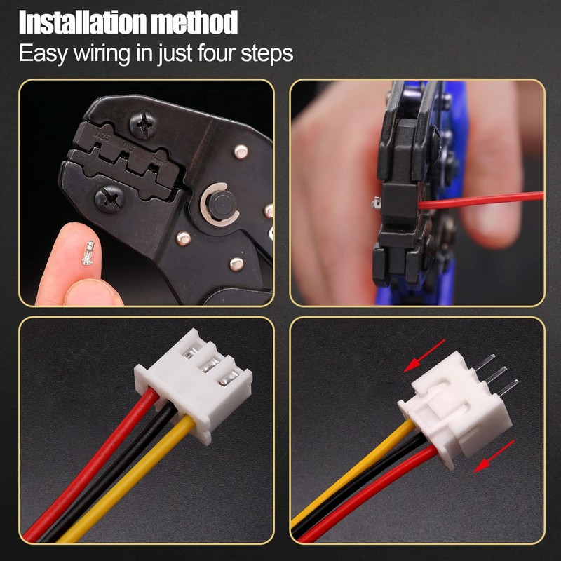 - This set of connectors is easy to install. Just put the female terminals in the tool and press them so that the crimp and insulation layer face the wires.