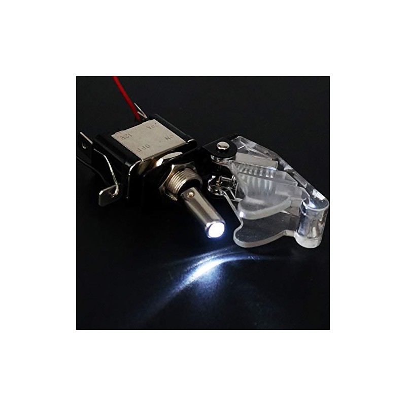 - Switch Actuation Style: Rocker;Spring loaded aircraft missile style flick cover;Color:White;LED Color:WhiteFunction: LED lighted toggle switch with 3 pins, SPST ON OFF